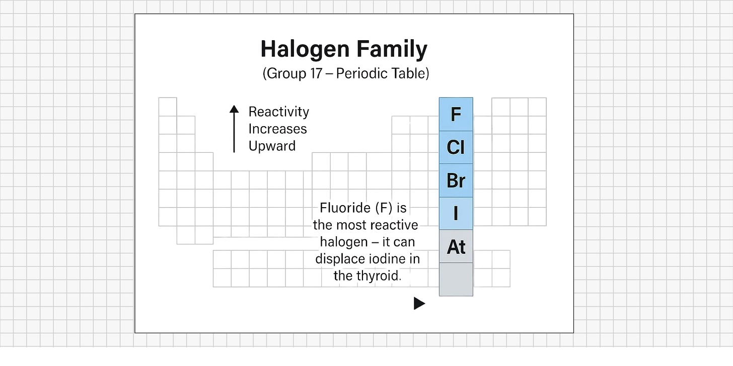 Fluoride is often described as “safe in small amounts,” yet its chemistry and behavior in the body tell a different story. As a member of the halogen family (alongside iodine, bromine, and chlorine), fluoride is highly reactive and competes directly with iodine for absorption. This is critical because the thyroid depends entirely on iodine to produce its hormones, T4 and T3, which drive metabolism and energy throughout the body.