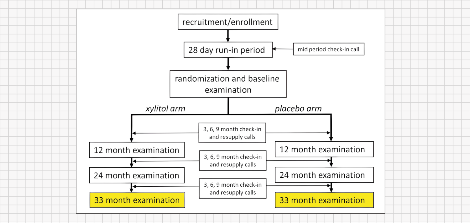 Consider the Xylitol for Adult Caries Trial (X-ACT), one of the most rigorous tests of xylitol’s real-world impact. This was a large, randomized, double-blind, placebo-controlled trial in adults with elevated cavity risk. A total of 691 participants took five 1-gram xylitol lozenges per day (about 5 g total) for 33 months - almost three years - while a control group took placebo lozenges.